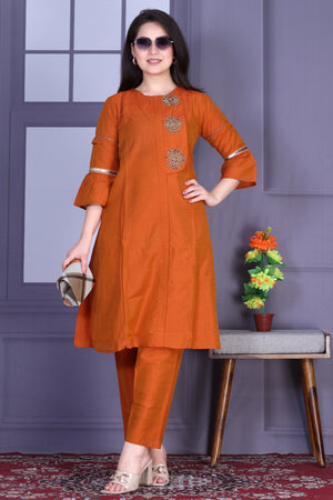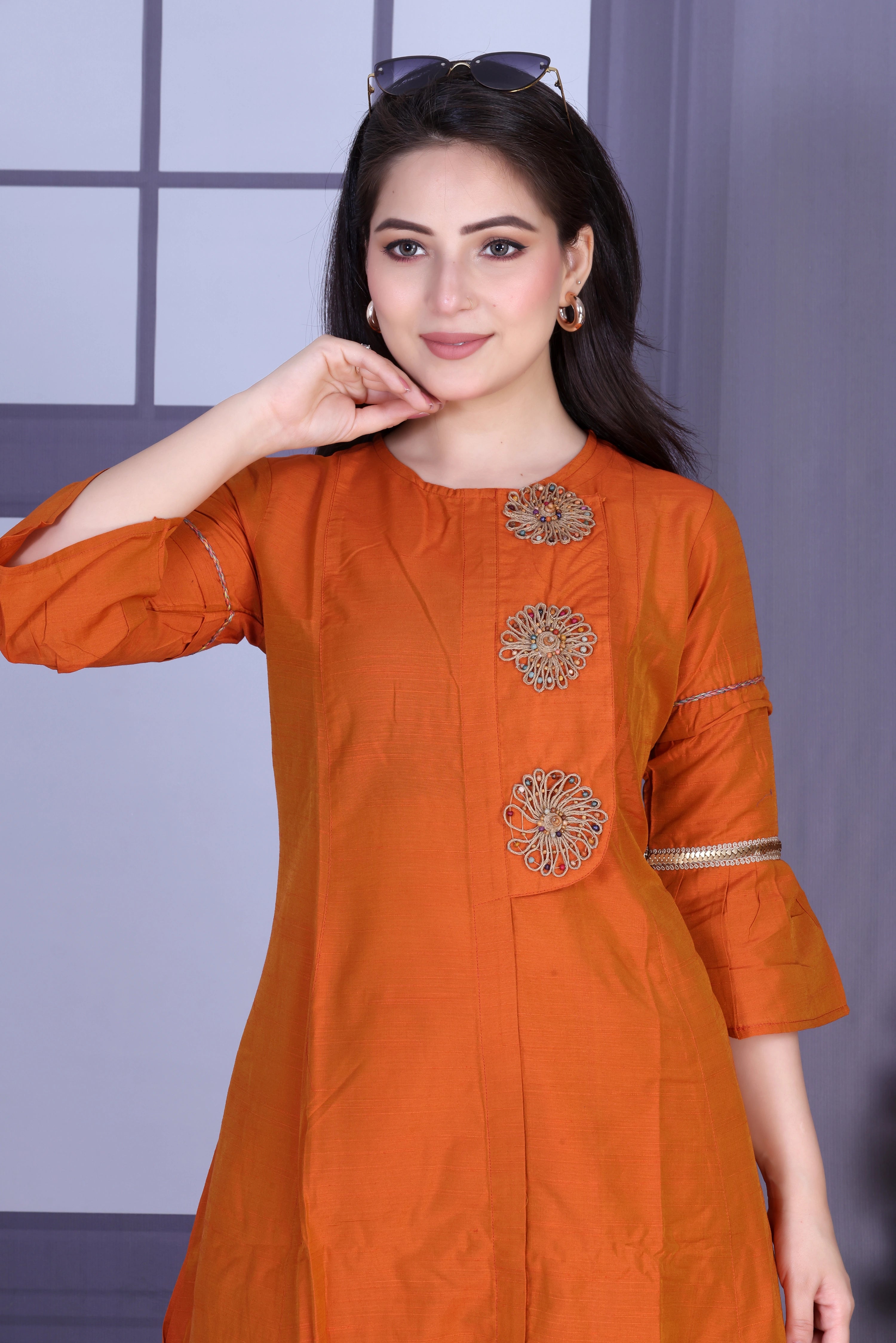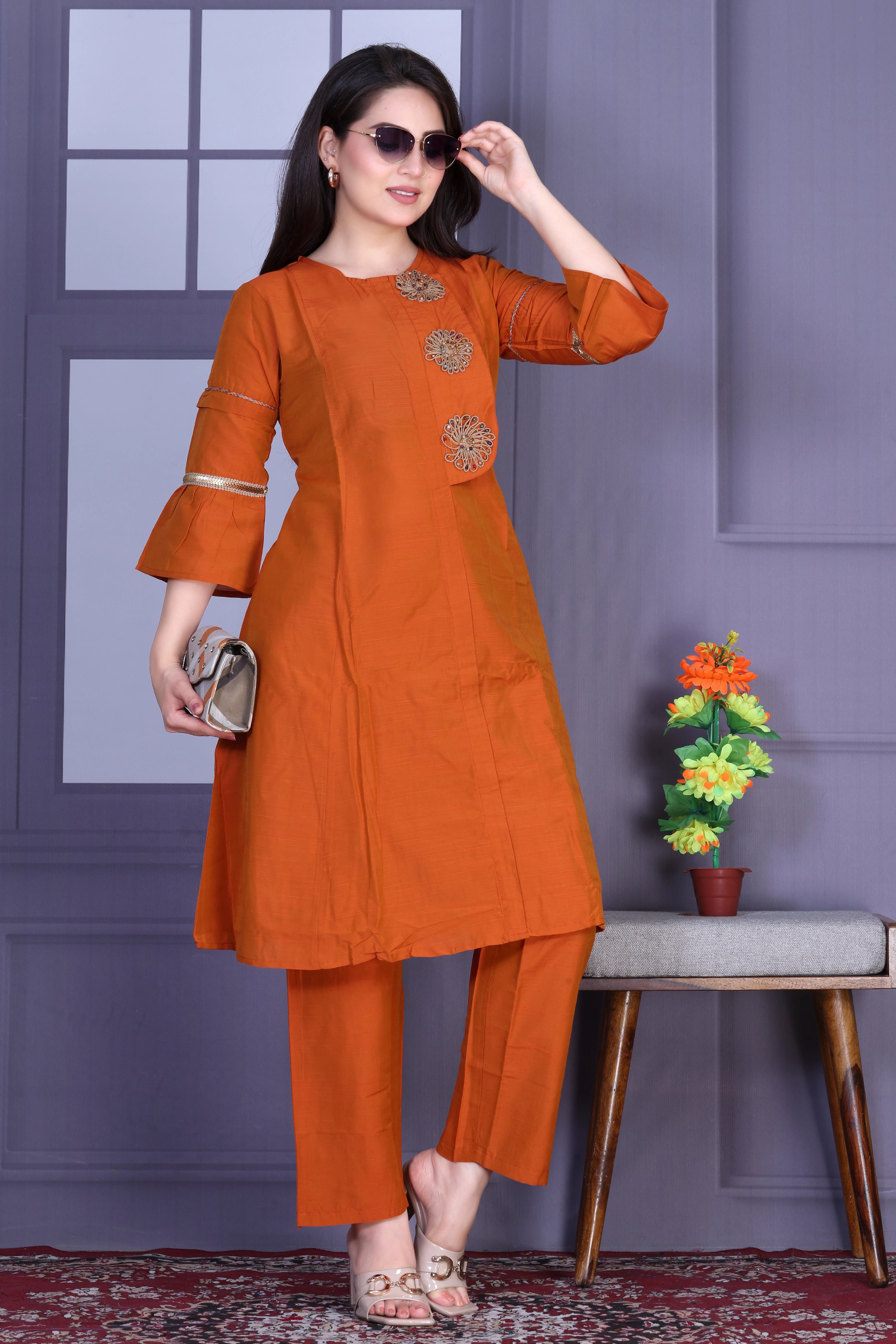 Celebrate the season in warmth and color with this burnt orange cotton silk co-ord set. Featuring detailed threadwork motifs and subtle embellishments, it’s crafted for the woman who loves classic elegance with a hint of vibrance. The structured silhouette drapes beautifully, making it ideal for festive brunches or cultural gatherings.