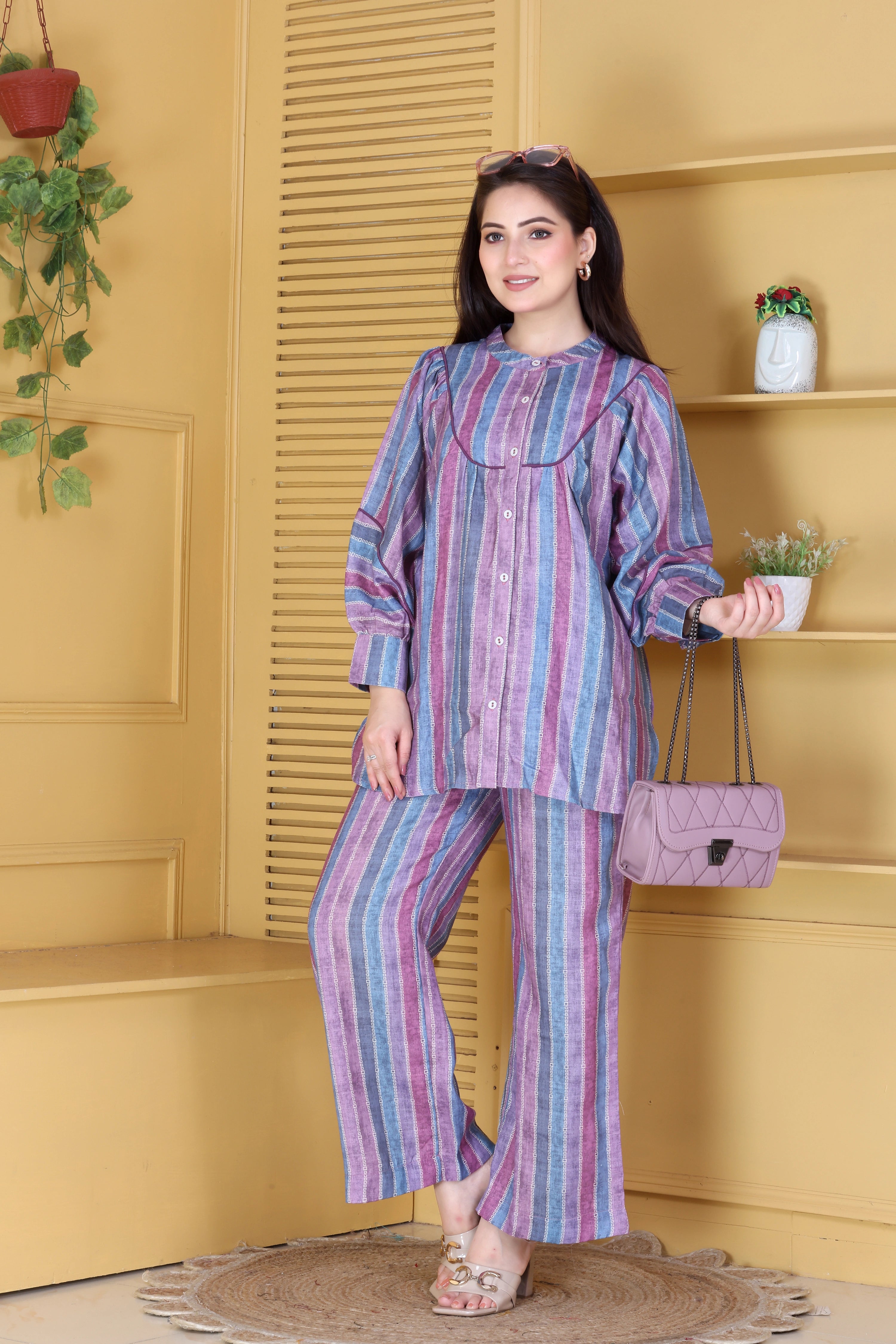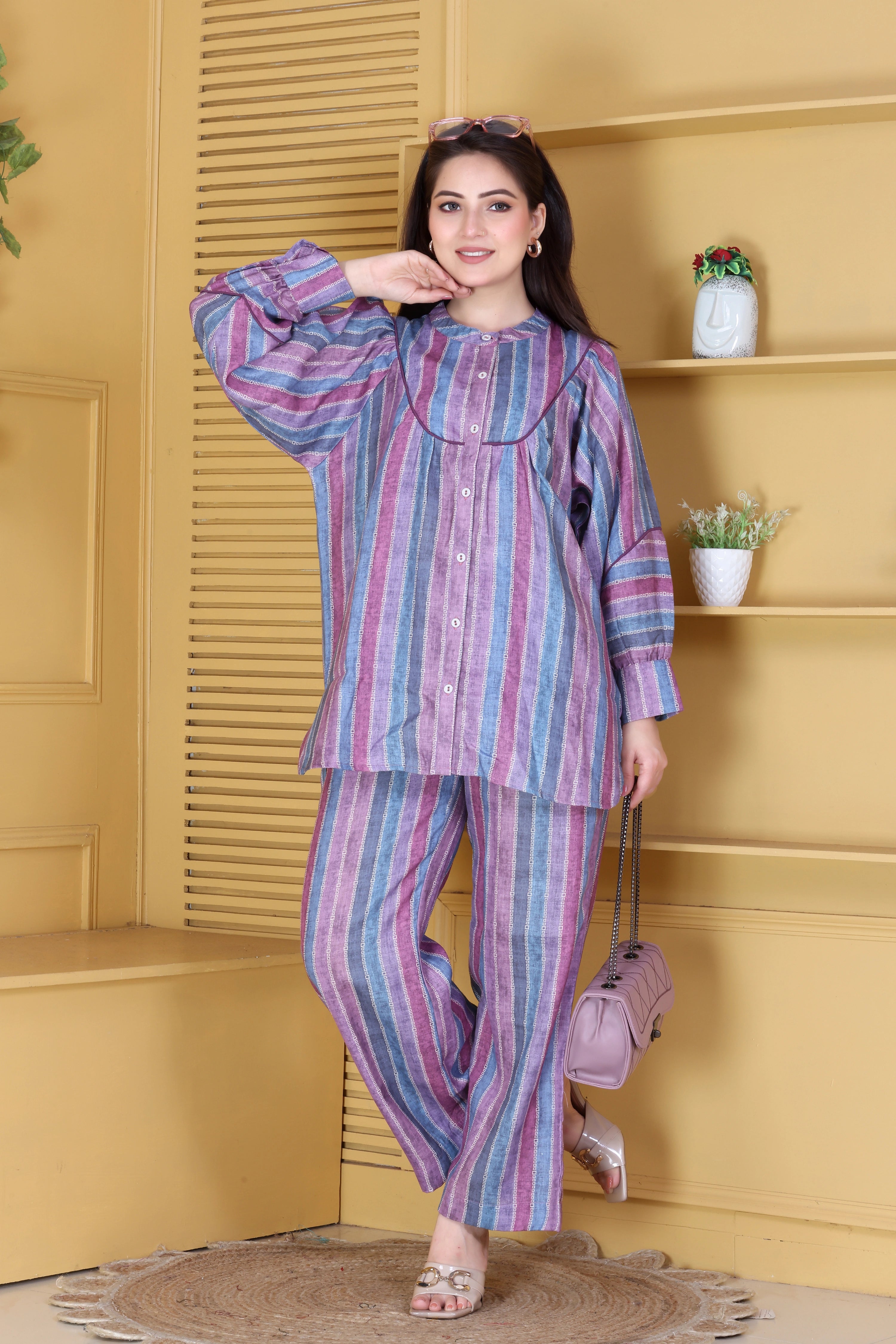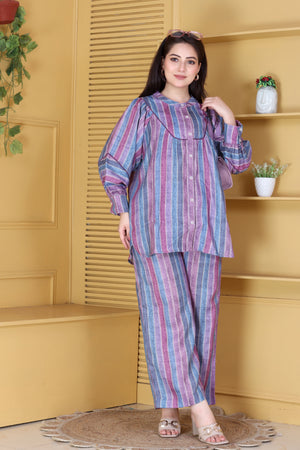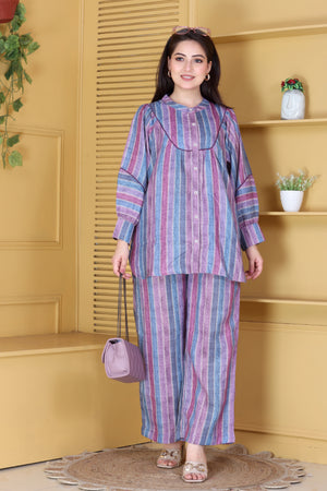 Soft hues, soothing comfort, and timeless charm — this lilac and blue striped linen co-ord set is a vision of effortless elegance. Crafted in breathable linen, it features a relaxed silhouette with delicate gathers and a round neckline accentuated by piping detail. The subtle pastel stripes lend it a fresh, modern appeal, perfect for leisurely brunches, travel diaries, or festive mornings at home.