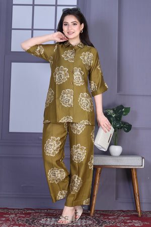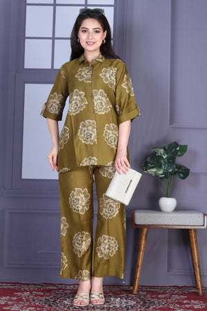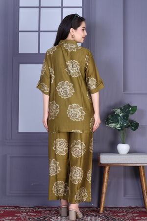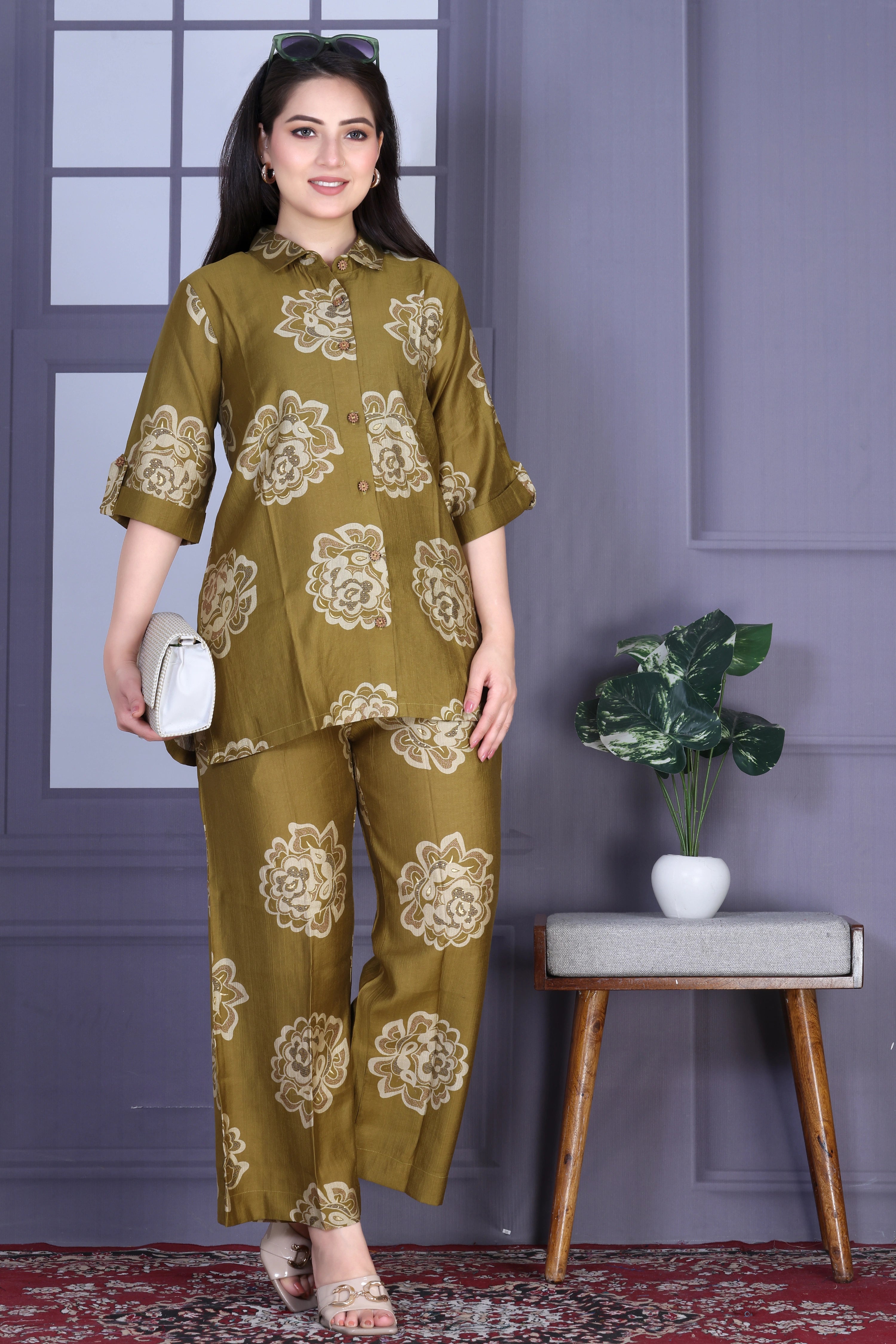 Step into festive sophistication with our olive blossom co-ord set in buttery-soft Vertican Silk. Adorned with oversized floral motifs, this outfit captures the essence of modern minimalism with an ethnic touch. Its subtle sheen and fluid silhouette make it a beautiful pick for celebratory evenings, festive lunches, or even travel wear.