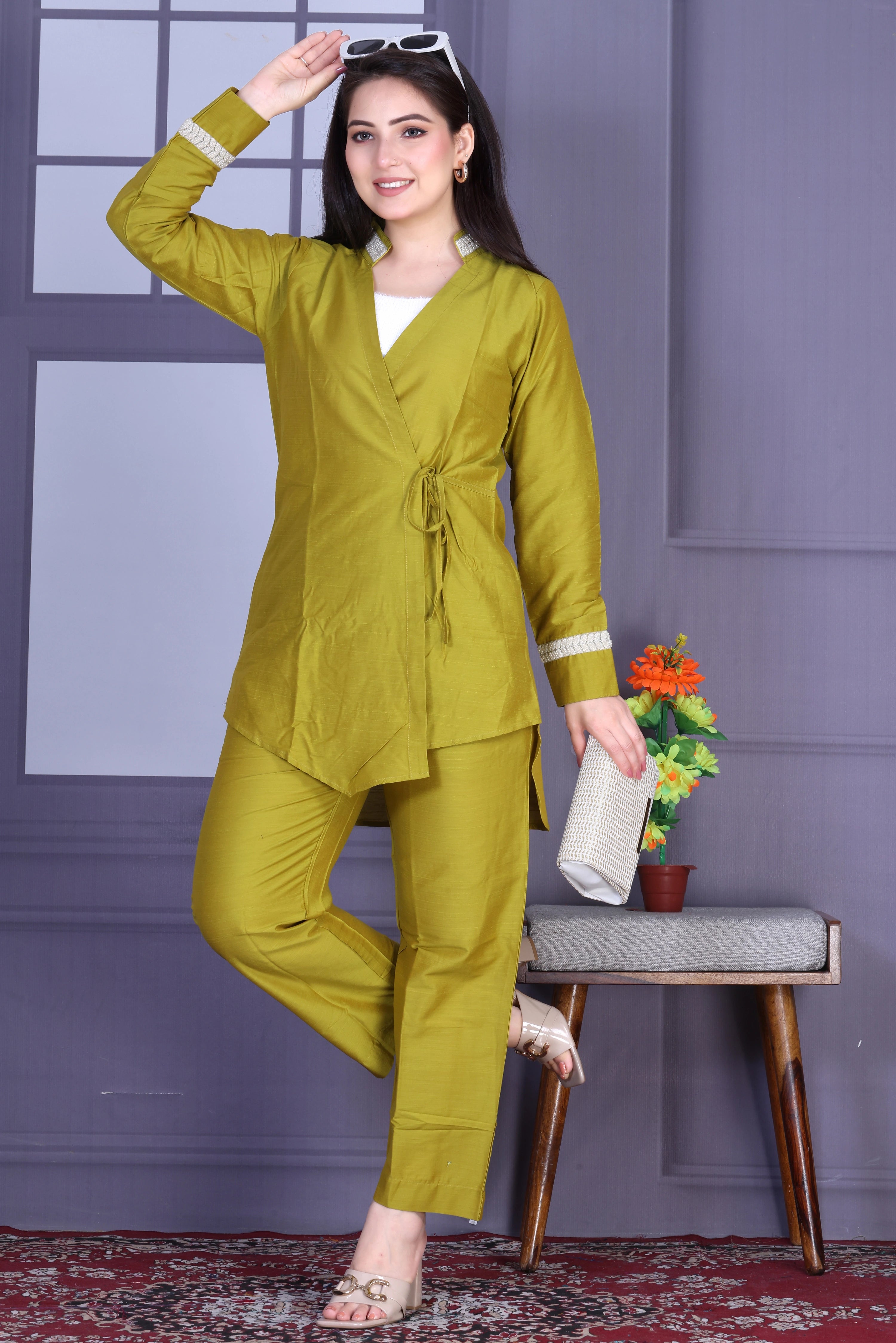 Modern minimalism meets festive grace in this olive green wrap-style co-ord set. Crafted in smooth cotton silk, it offers a soft, luminous finish and an ultra-flattering fit. The side-tie detail adds a contemporary twist, making it a timeless piece that transitions seamlessly from day to evening.