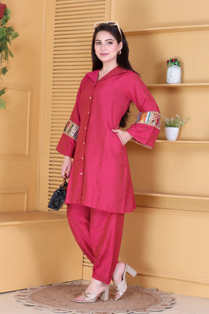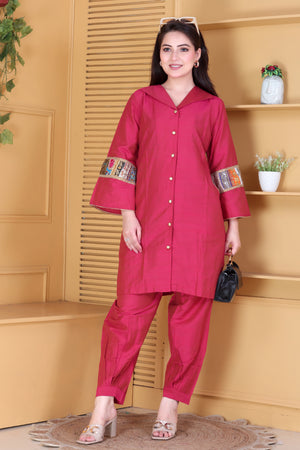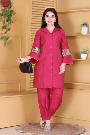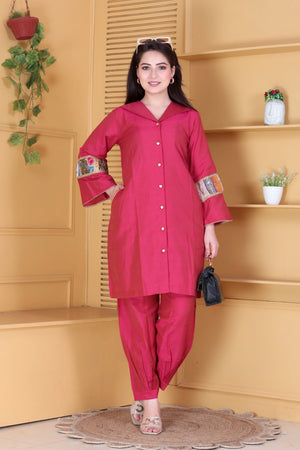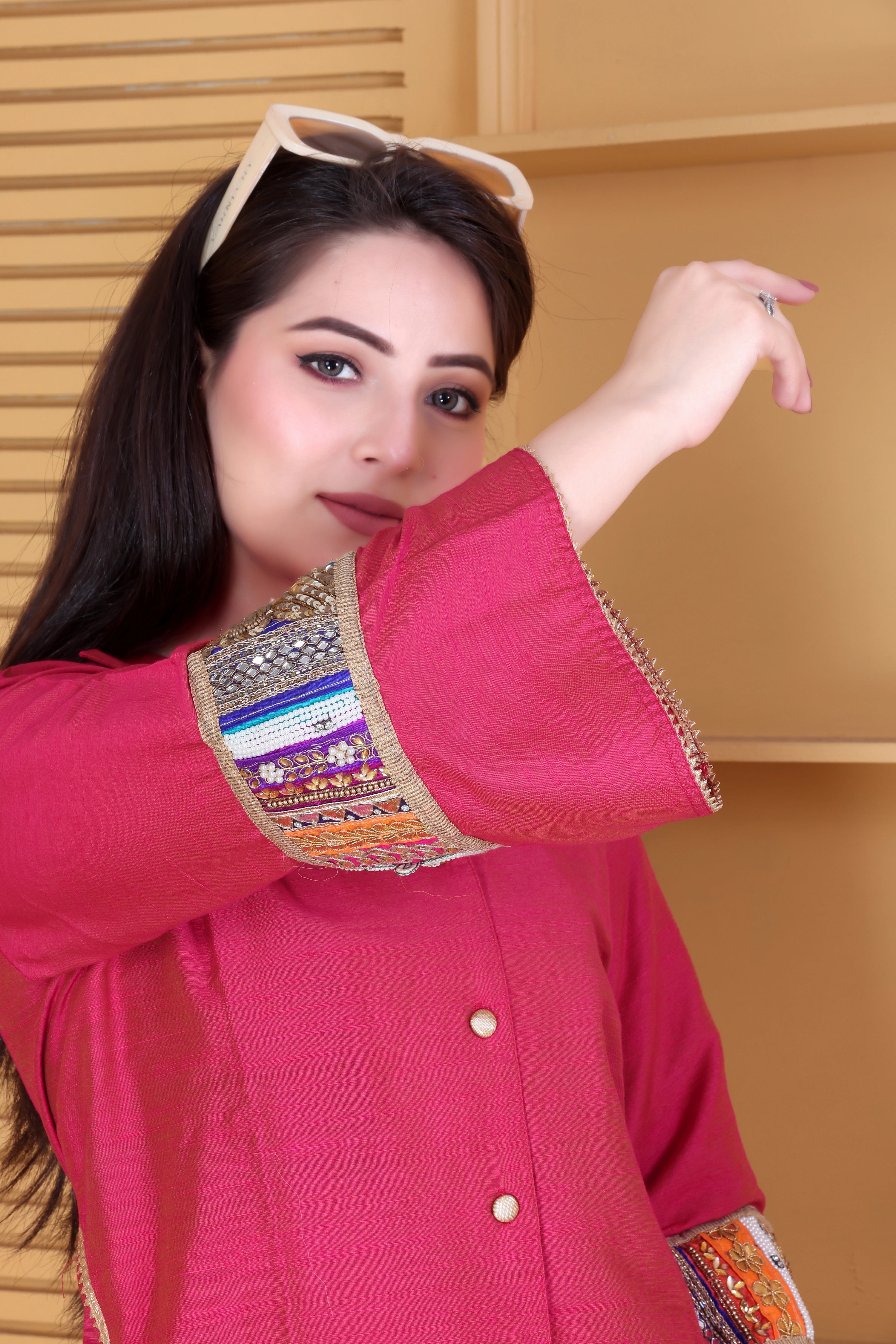 Vibrant yet refined, this raspberry pink cotton silk co-ord set radiates festive sophistication. Designed with delicate mirror-work-inspired embroidery (khichdi Gota) on the sleeves, it brings together the richness of silk and the comfort of cotton. The soft sheen of the fabric makes it perfect for both day and evening celebrations — effortlessly elegant, undeniably Visramaa.